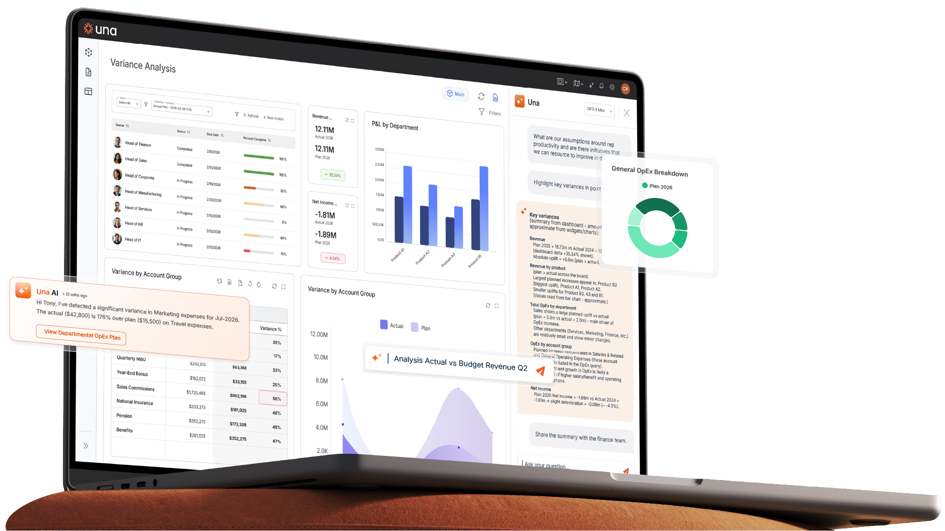 From high-level strategy to granular operational drivers, Una covers the full spectrum of FP&A. Una replaces static events with continuous, AI-native solutions that adapt instantly to change—ensuring every part of the business stays aligned.
