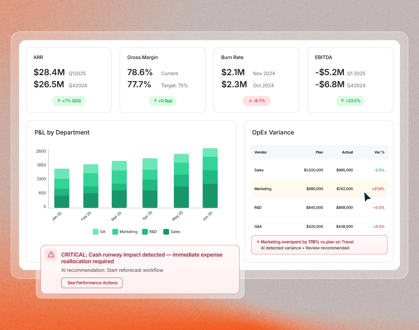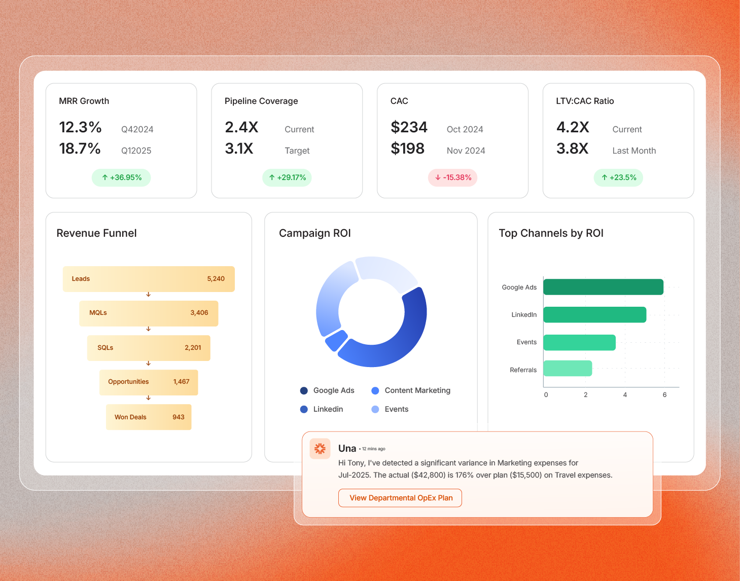 Una AI helps you take action, not just make observations. It highlights risks, anomalies, and missed targets, recommends next steps, and automatically prepares leadership-ready narratives.
